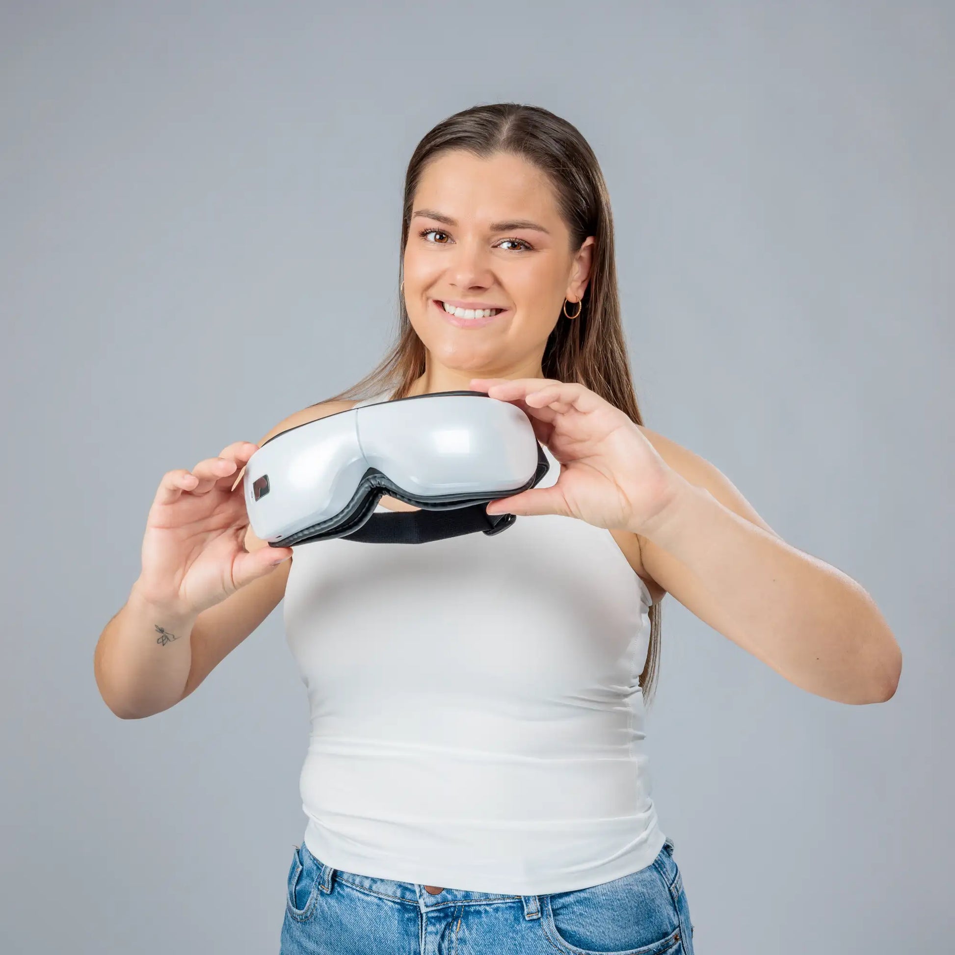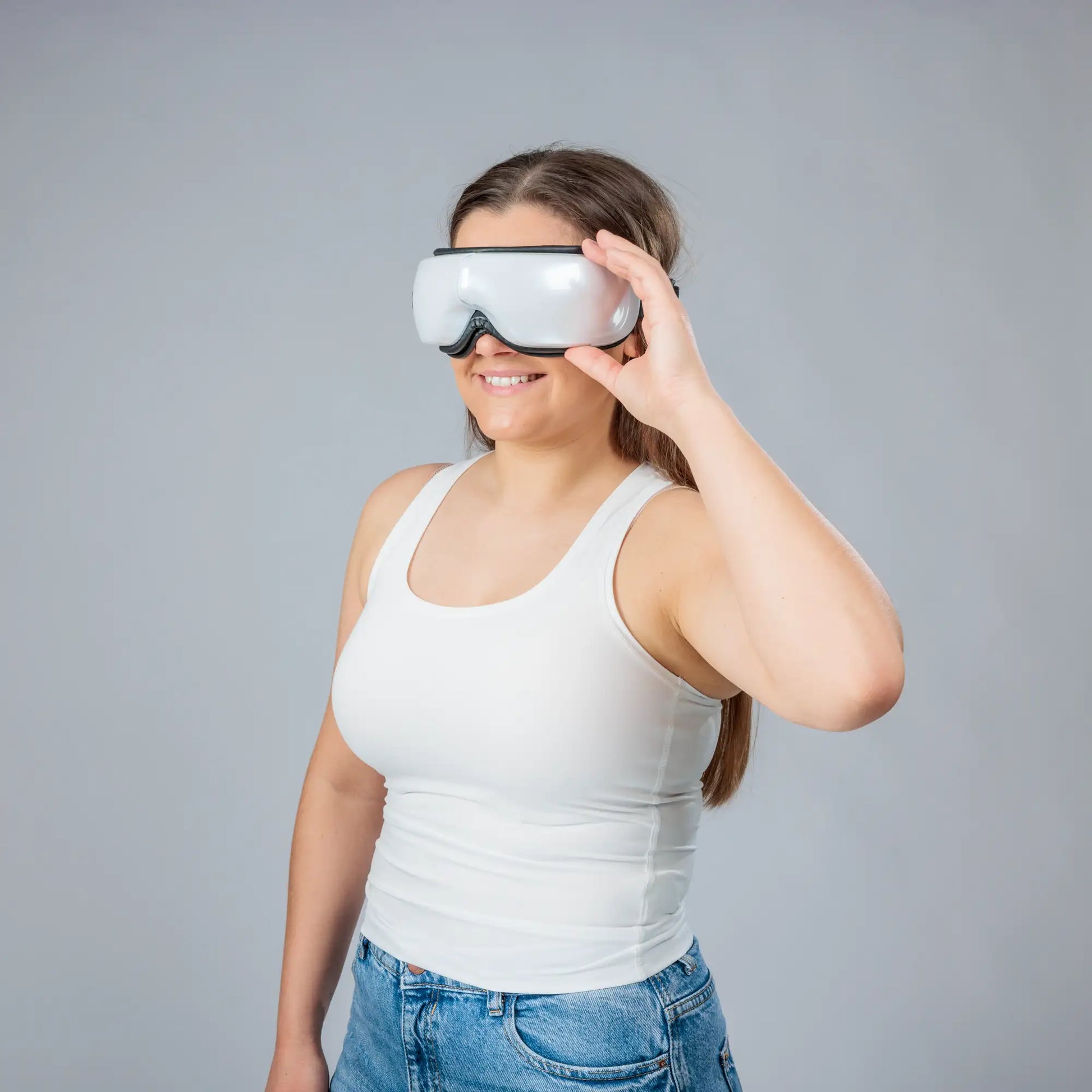 It uses a combination of air pressure, gentle vibration, heat, and music to relax the muscles around your eyes, relieve tension, and improve circulation.